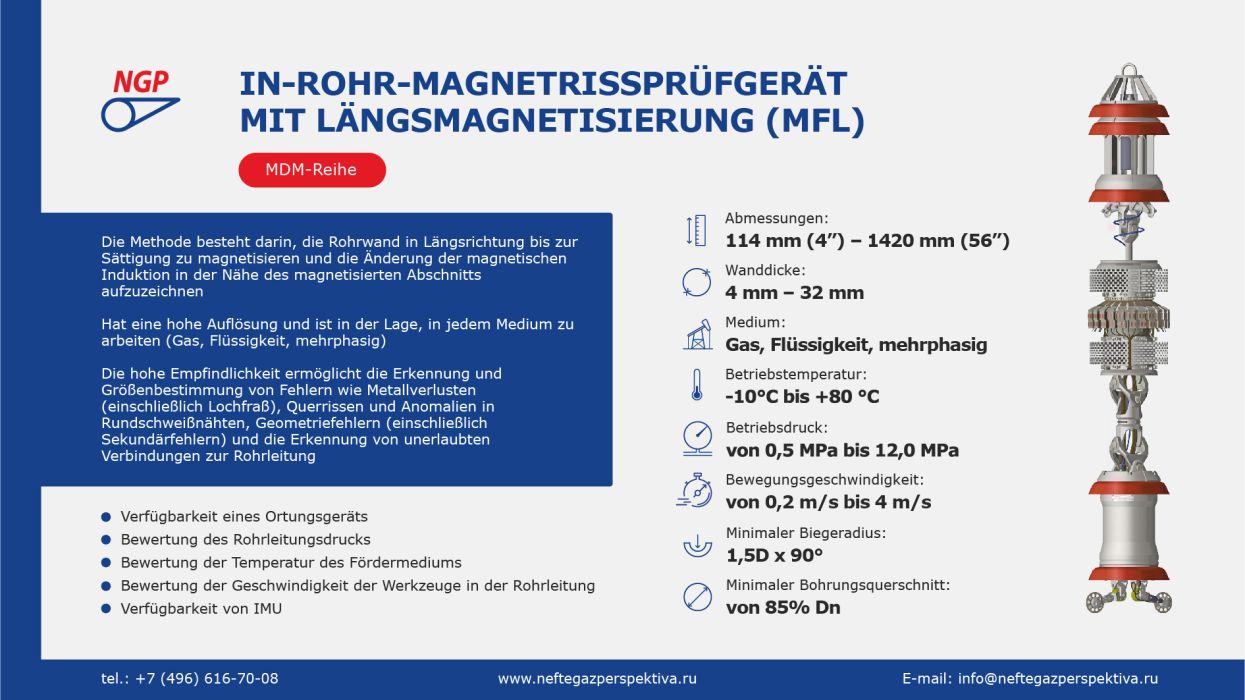 Die von NGP GmbH entwickelten hochauflösenden magnetischen Prüfgeräte können Anomalien wie Metallverluste, Querrisse und Ringschweißnahtanomalien erkennen und deren Größe bestimmen. Sie verfügen über eine der besten Eigenschaften bei der Bestimmung der Winkelposition von Merkmalen und der zurückgelegten Entfernung, eine erhöhte Wahrscheinlichkeit der Unterscheidung zwischen internen und externen Defekten und einen niedrigen Geräuschpegel, der eine genauere Erfassung der Hintergrundkorrosion ermöglicht.