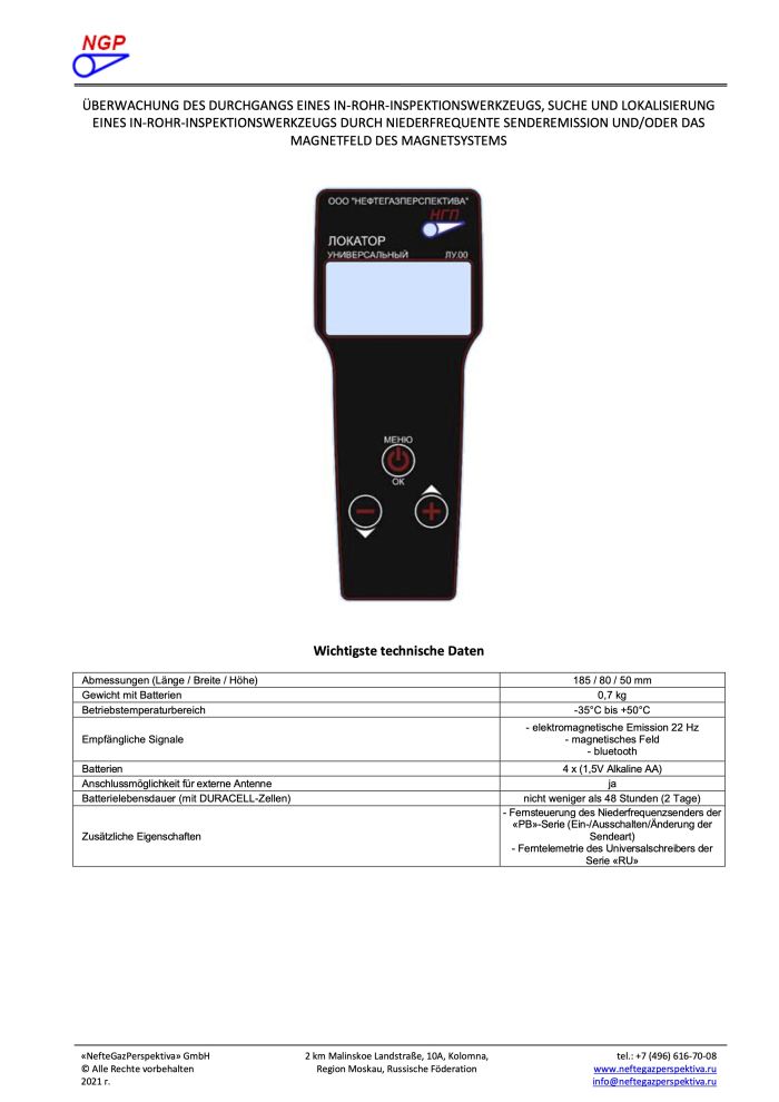 Dient zur Überwachung des Durchgangs eines Geräts in der Leitung, zur Suche und Ortung eines Geräts in der Leitung durch Aussendung eines Niederfrequenzsenders und/oder durch das Magnetfeld eines Magnetsystems.