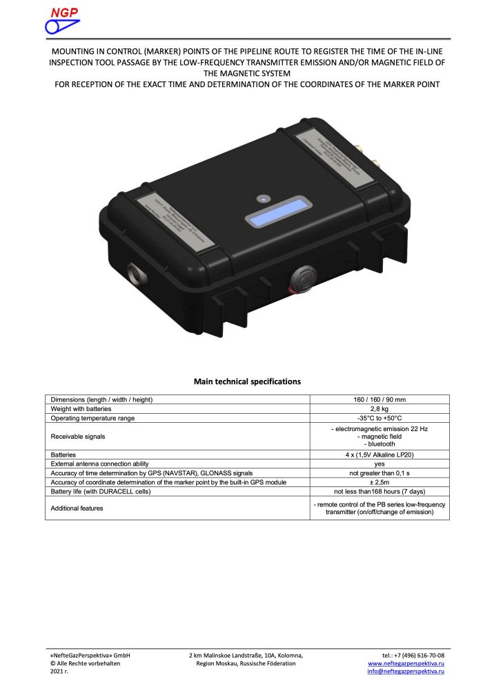 Wird an den Referenzpunkten (Markierungspunkten) der Pipeline-Strecke installiert, um die Durchlaufzeit des Geräts in der Leitung durch Aussendung des Niederfrequenzsenders und/oder des Magnetfelds des Magnetsystems aufzuzeichnen.